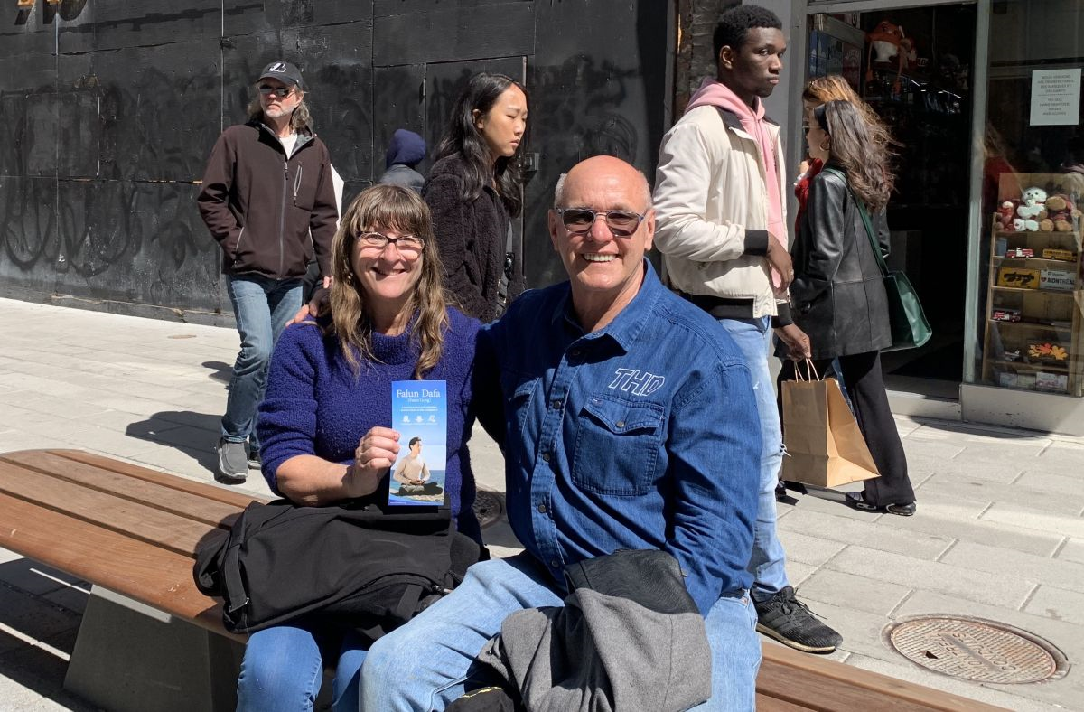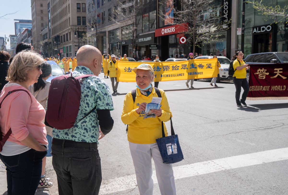 从三河市(Trois-Rivières)来蒙特利尔旅游的戴安娜・普鲁夫(Diane Plouffe)(左)说:“这是非常美丽的游行,而且是告诉人们在中国的人权迫害。打坐对人们很有好处,让人平和,这支队伍经过时让人感到平和。”