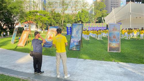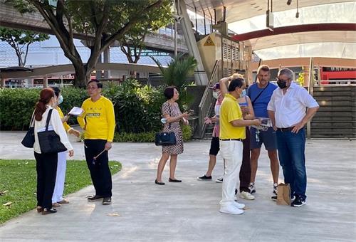 一位澳洲直播主恰巧步入芳林公园,马上做起了直播。在听闻法轮功真相后,他表示会上网查看更多资讯。一队德国友人第一次看到法轮功学员,他们停留与学员交谈,了解真相,并拍照留念。一个新加坡小伙子早就知道中共的坏名声,但当听到中共残酷迫害法轮功的罪行后,仍感震惊。两位刚到新加坡的中国年轻人,欣然用张福、张晓化名声明退出中共邪党团队组织。