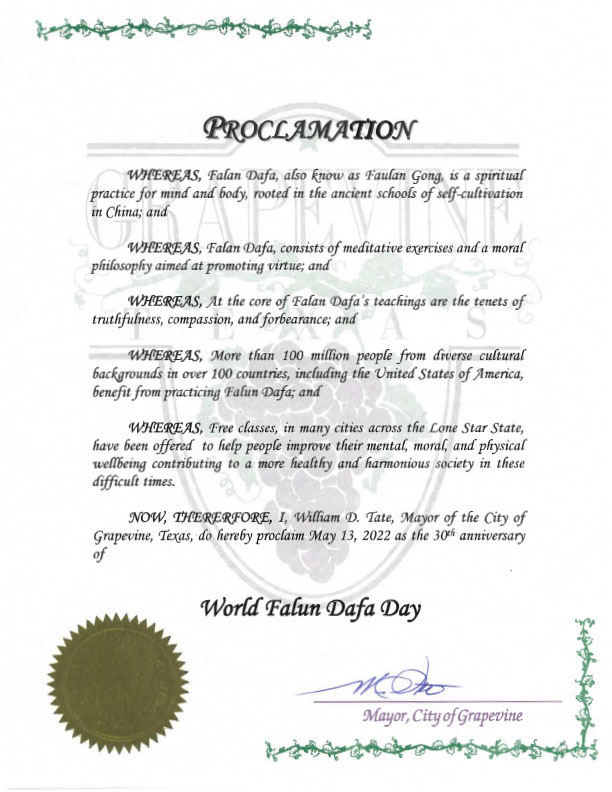 鉴此,我,威廉姆·塔特(William D. Tate),葡萄藤市市长,宣布二零二二年五月十三日为“法轮大法日”。
