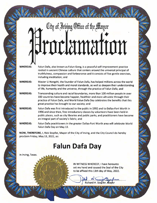 鉴于,二零二二年五月十三日,将是法轮大法在社会上传出三十年纪念日和第二十三个世界法轮大法日。达福地区的法轮功学员将于五月八日在布兰诺市的Russell Creek Park庆祝这个日子。
