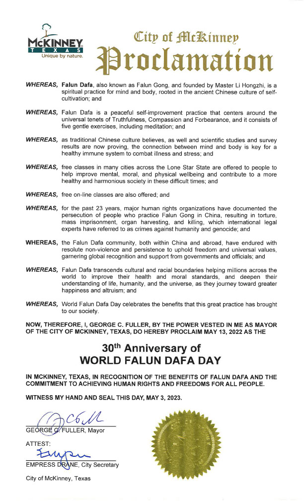 鉴此,我,乔治·富勒(George C Fuller),麦肯尼市市长,宣布二零二二年五月十三日为麦肯尼市“法轮大法日”。