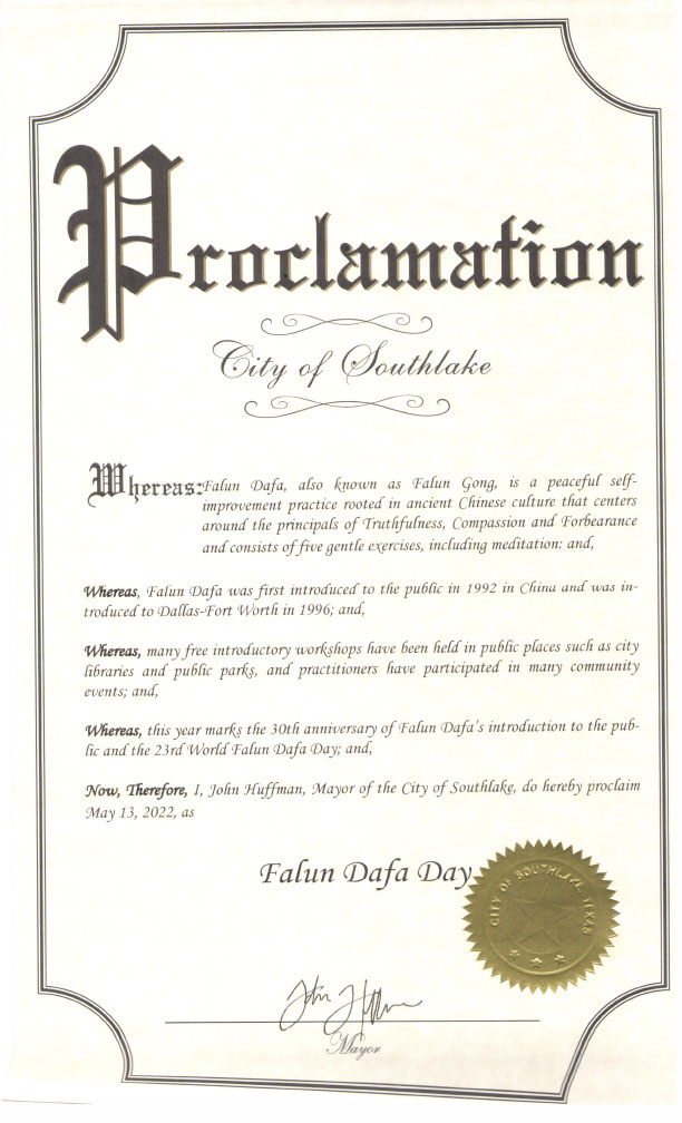 【明慧网二零二二年五月十一日】(明慧记者曾洪美国达拉斯报道)五月十三日是世界法轮大法日,二零二二年的五月十三日是法轮大法创始人李洪志先生传法三十周年纪念日。美国德克萨斯州的艾伦市(City of Allen)、雪松山市(City of Cedar Hill)、锦绣市(City of Fairview)、葡萄藤市(City of Grapevine)、艾文市(City of Ivring)、麦肯尼市(City of McKinney)及南湖市(City of Southlake)的市长给美南法轮大法学会发来褒奖,宣布这一天为本市的法轮大法日,以表彰法轮大法为社会、社区的贡献,和对法轮大法的支持。