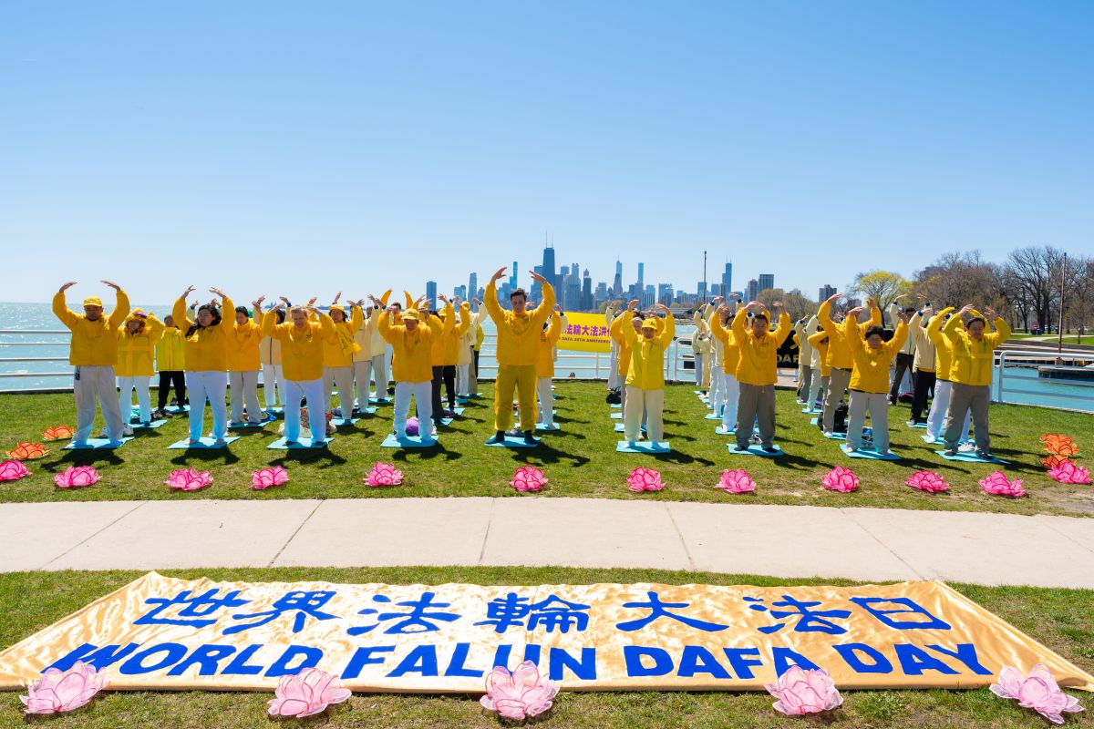 【明慧网二零二二年五月十一日】“芝加哥大法弟子恭祝师尊生日快乐!法轮大法好!真善忍好!”二零二二年五月七日,美国大芝加哥地区部分法轮功学员在密西根湖畔向法轮功创始人李洪志先生表达感恩之情。他们在湖边公园集体炼功,庆祝法轮大法弘传三十周年。祥和优美的功法,吸引了很多锻炼的人和游客驻足观看,了解详情。