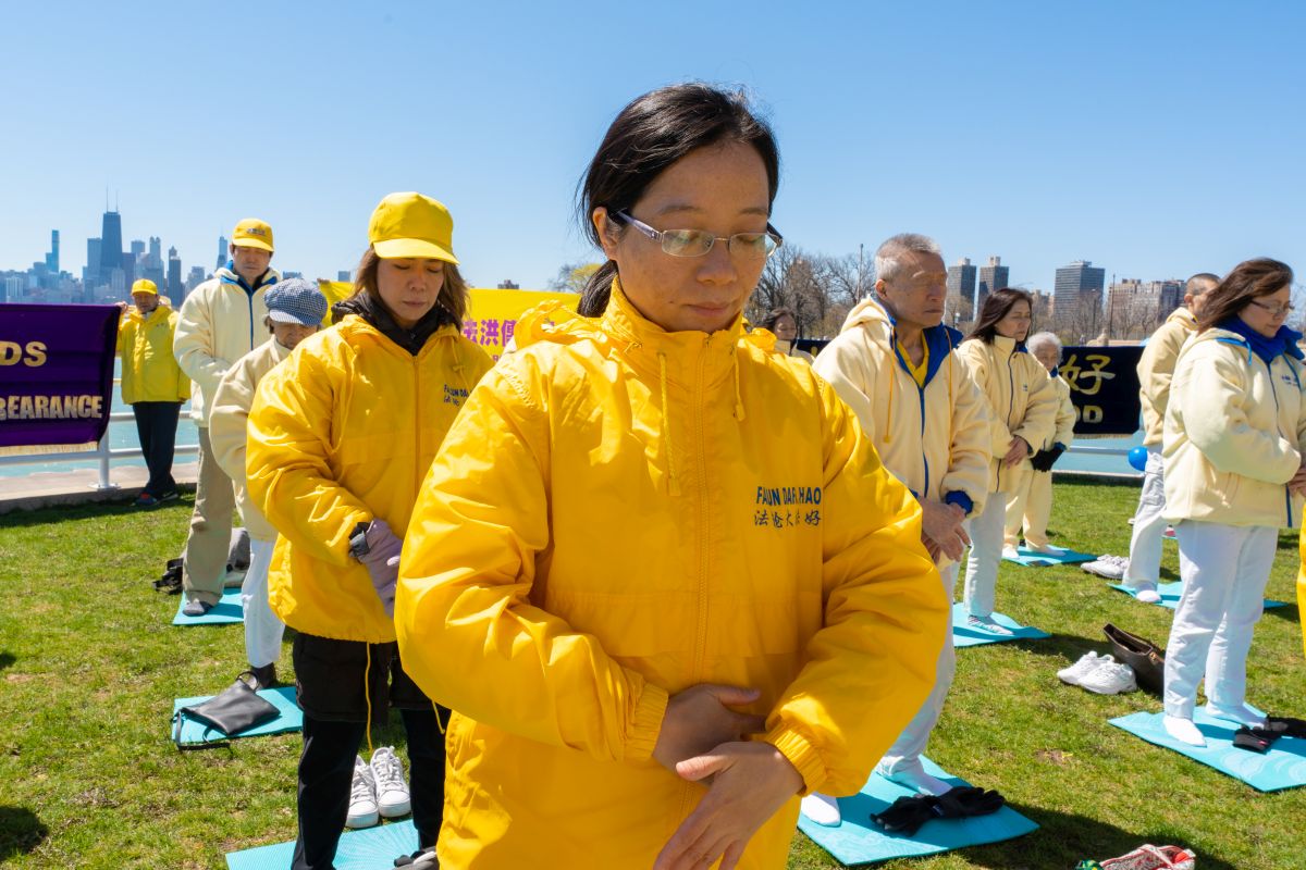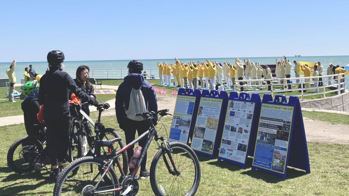 图4-5:二零二二年五月七日,大芝加哥地区部分法轮功学员在密西根湖畔集体炼功,民众主动前来了解法轮功。