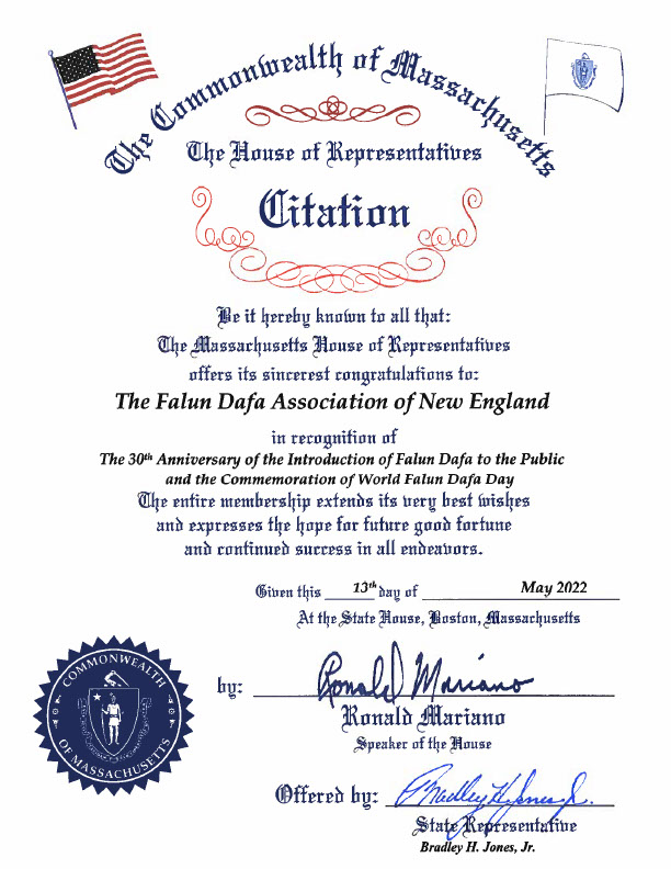 谨在此公布:麻萨诸塞州众议院恭祝新英格兰法轮大法协会、祝贺法轮大法洪传三十周年并庆贺法轮大法日。全体议员向你们传达最佳祝福,希望诸事好运,持续成功。