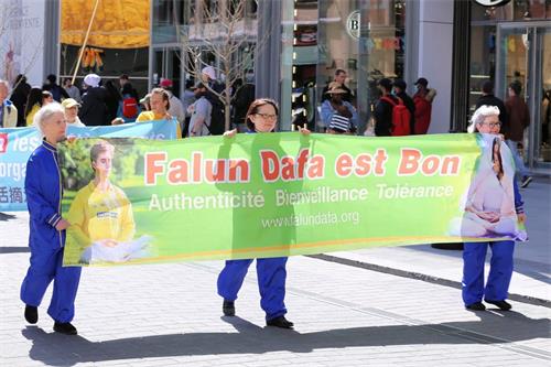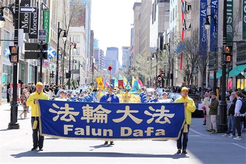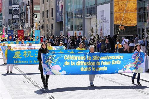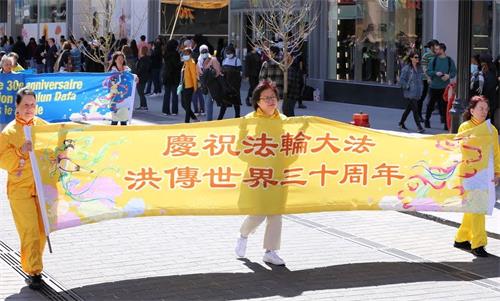 五月七日下午,来自魁省多个城市的法轮功学员,组成了天国乐团、真相横幅、功法展示、彩旗阵等几个游行方阵。下午两点,游行队伍从市中心凯博广场出发,沿着蒙特利尔最繁华的商业大道圣凯瑟琳大街行进,将大法传世、普天同庆的喜悦一路传播。在抵达终点艺术中心广场后,法轮功学员拍摄合影和录像,齐声向师父表达感恩:恭祝师父生日快乐,谢谢师父!