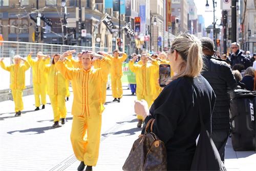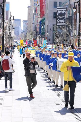 ![]() 图4~11:二零二二年五月七日,,魁北克法轮功学员举行了庆祝世界法轮大法日的盛大游行,吸引两旁路人观看,有的还跟着队伍拍摄,有的跟学员交谈。 |