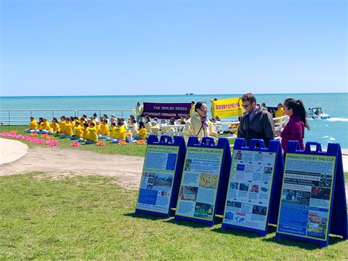 图4-5:二零二二年五月七日,大芝加哥地区部分法轮功学员在密西根湖畔集体炼功,民众主动前来了解法轮功。