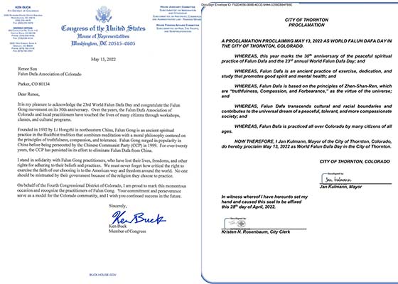 法轮大法弘传30周年之际,科罗拉多国会议员肯·巴克发来贺信。科罗拉多州桑顿市也宣布2022年5月13日为桑顿市世界法轮大法日。