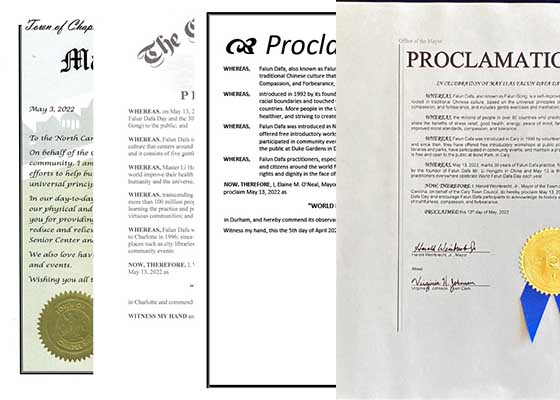 今年五月十三日,是法轮大法弘传世界三十周年暨第二十三届世界法轮大法日。北卡州四个城市市长颁发了褒奖或致敬信。
