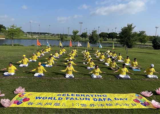 五月八日,美国德州达拉斯-沃斯堡地区的法轮功学员在布兰诺市(的 Russell Creek公园集体炼功,庆祝法轮大法弘传三十周年。