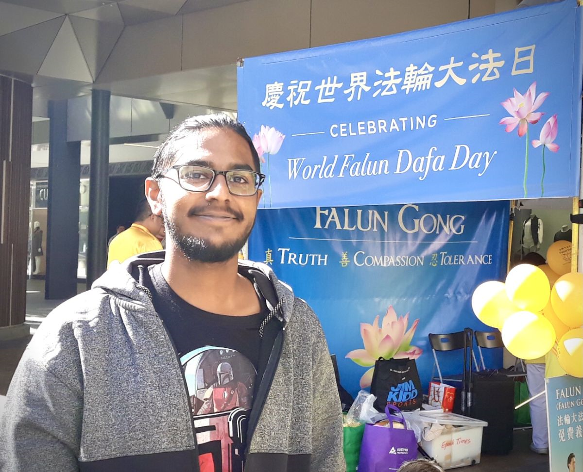 来自印度的劳伦斯(Jethin Laurence)赞美法轮功使人身心受益,他说:“打坐对身体和精神灵魂都有好处,我很高兴,人们在炼这个功法。”