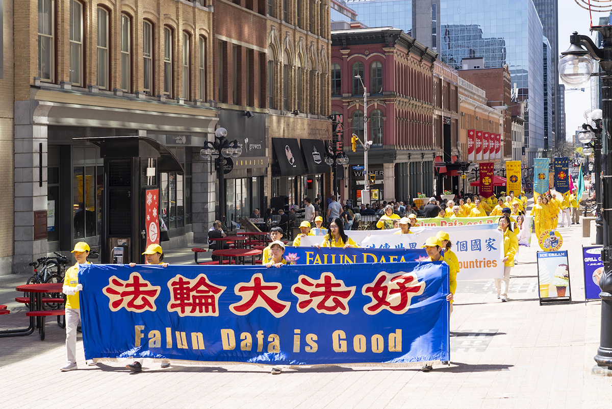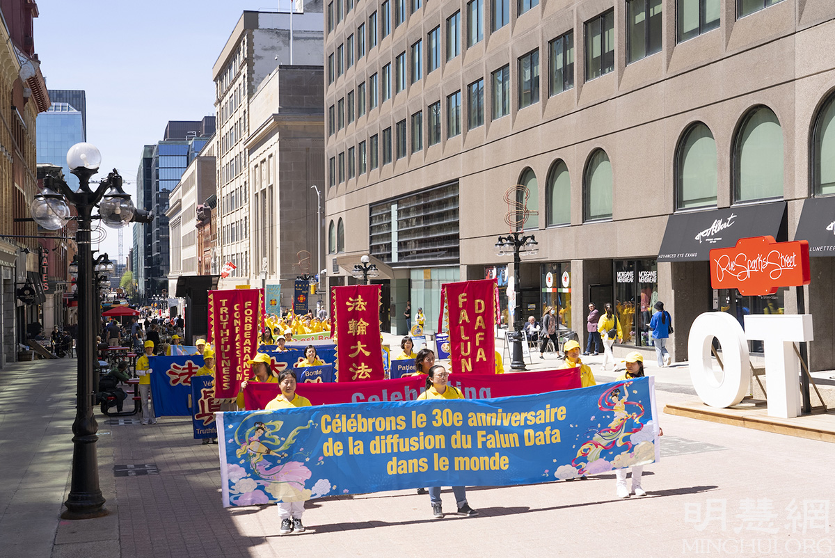 图7-9:2022年5月10日,来自加拿大东部部分法轮功学员汇聚在首都渥太华国会山前,庆祝法轮大法洪传三十周年。图为法轮功学员在市中心步行街遊行。
