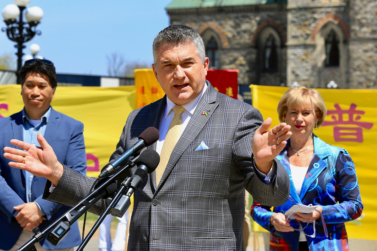 图11:贝赞(James Bezan)议员在发言中说:“法轮大法在加拿大和世界各地产生的积极影响。我要感谢所有逃离共产主义中国,并以加拿大为家的人。感谢你们使我们成为一个更美好、更强大的国家。”