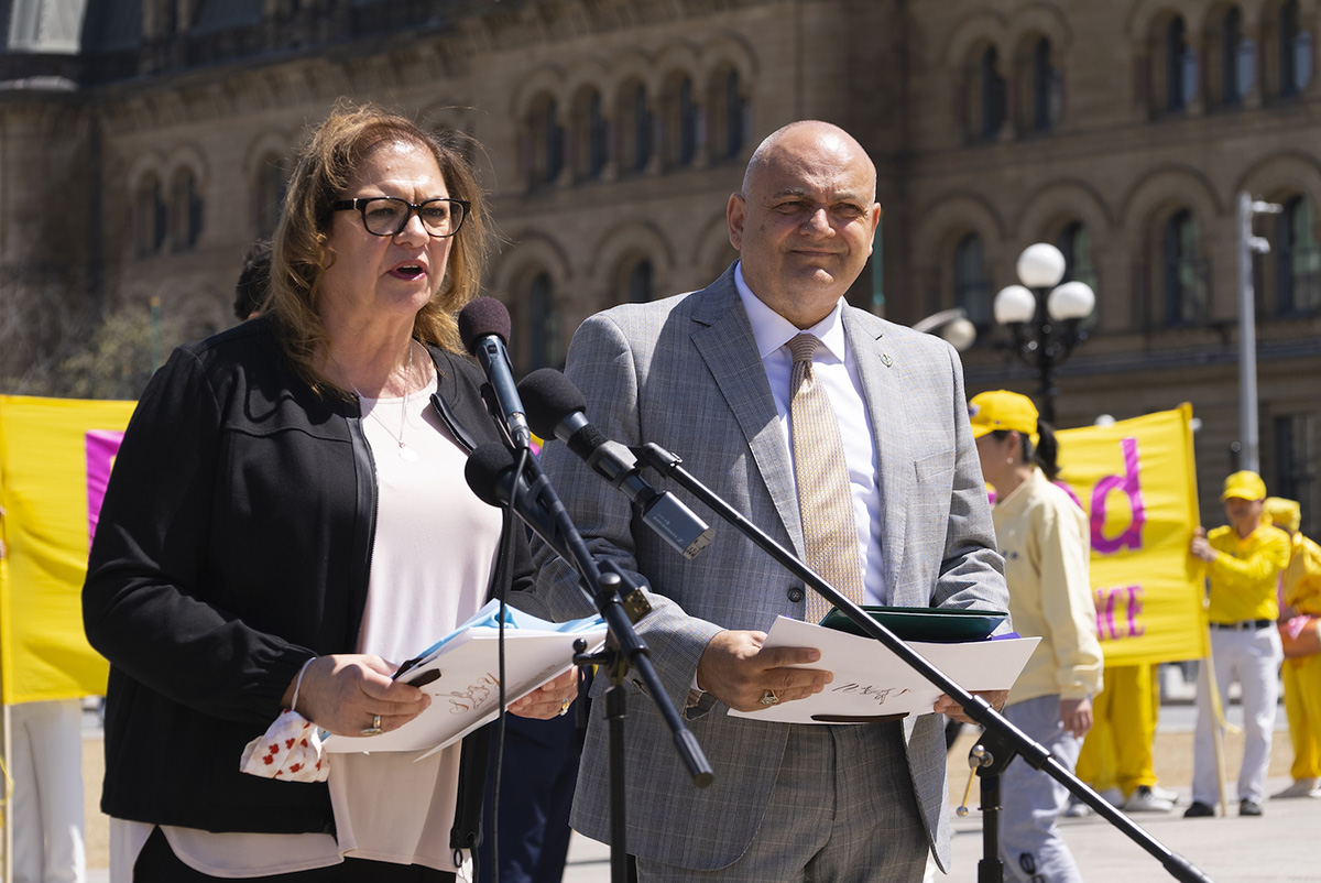 图14:罗伯茨(Anna Roberts)和布鲁克(Larry Brock)议员均表示,法轮功的真善忍价值观,让加拿大人感到共鸣。