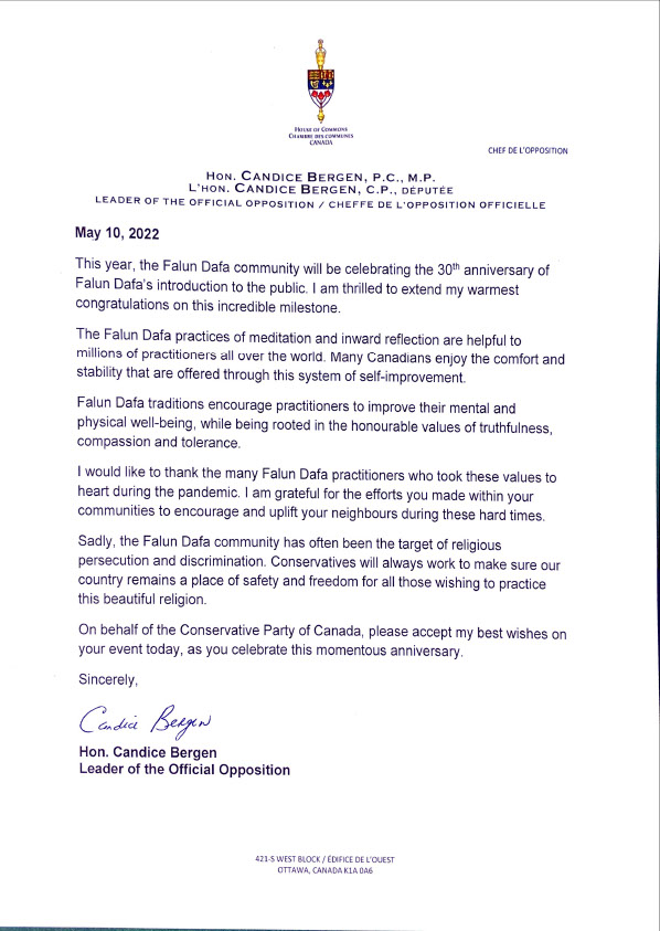 保守党领袖博根在当天贺信中说:“我很高兴对这个令人难以置信的里程碑表示最热烈的祝贺。法轮大法的打坐和内省有助身心。许多加拿大人享受着通过这个自我提升(修炼)体系提供的舒适和稳定。法轮大法鼓励修炼者改善身心健康,同时根植于真、善、忍的崇高价值观。我要感谢在疫情期间将真善忍价值观铭记在心的众多法轮大法修炼者。感谢您们在困难时期,在社区内对街坊邻居的不断鼓励和提升其健康所做的努力。”