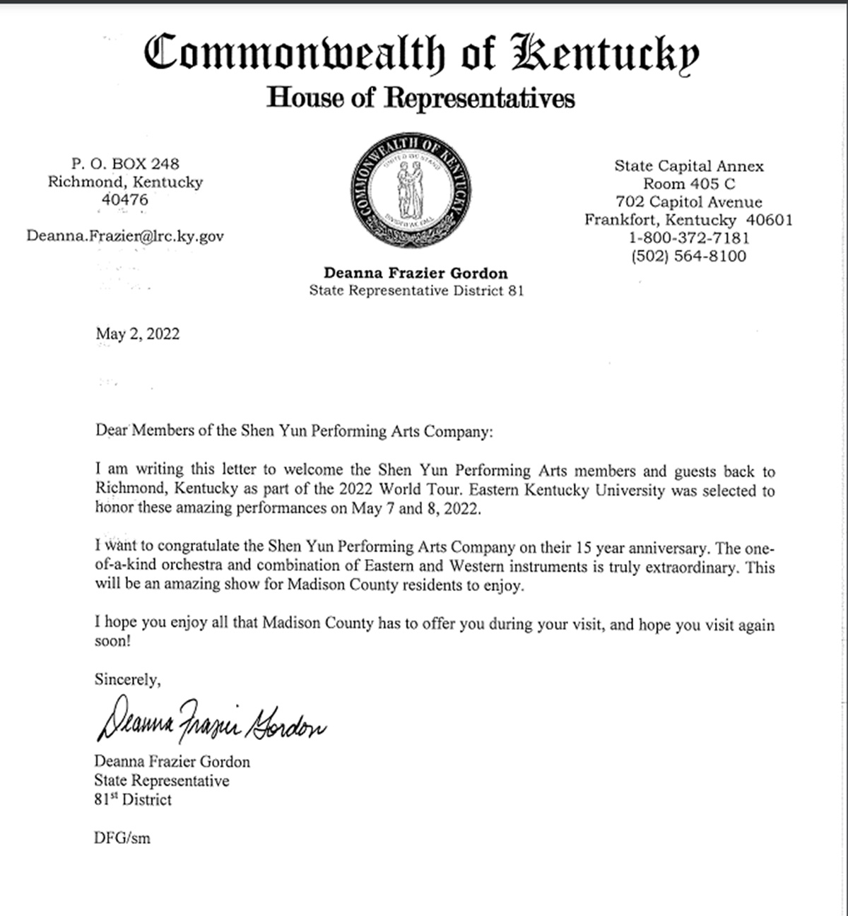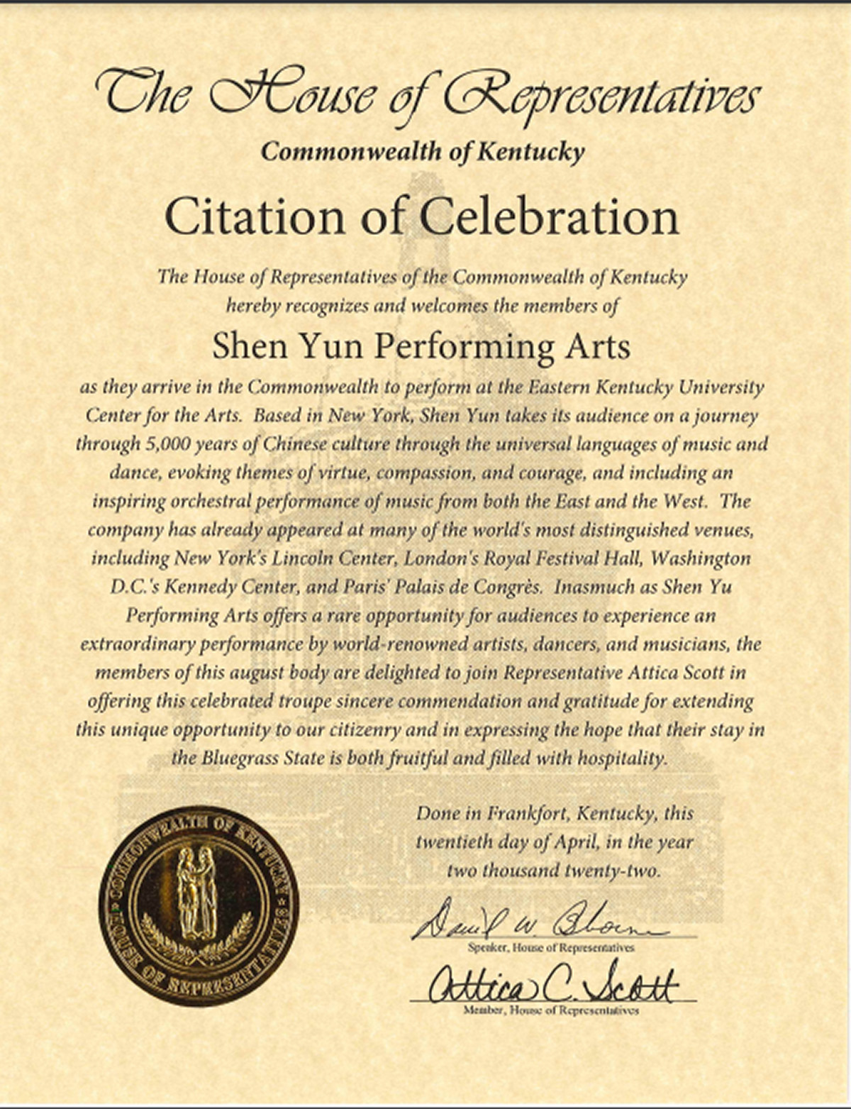 肯塔基州众议院议长奥斯本(David Osborne)和第41区州众议员(Attica Scott)联名发贺信。贺信中写道:“肯塔基观众将通过这个难得的机会欣赏到神韵艺术团的世界著名艺术家、舞蹈家和音乐家的非凡演出。”