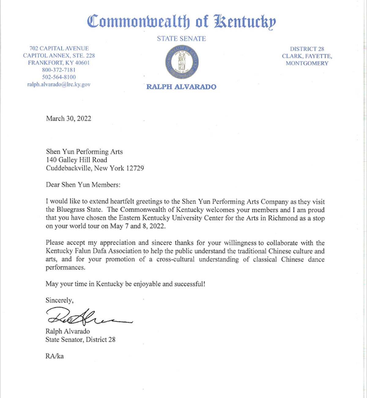 肯塔基州第二十八区参议员阿尔瓦拉多(Ralph Alvarado)在贺信中写道:“在神韵艺术团访问蓝草之州之际,我谨向他们致以诚挚的问候。肯塔基州欢迎神韵艺术家们,神韵艺术团选择了位于里士满的东肯塔基大学艺术中心作为神韵艺术团二零二二年五月七日至八日世界巡演的一站的演出场地,对此我感到非常自豪。”