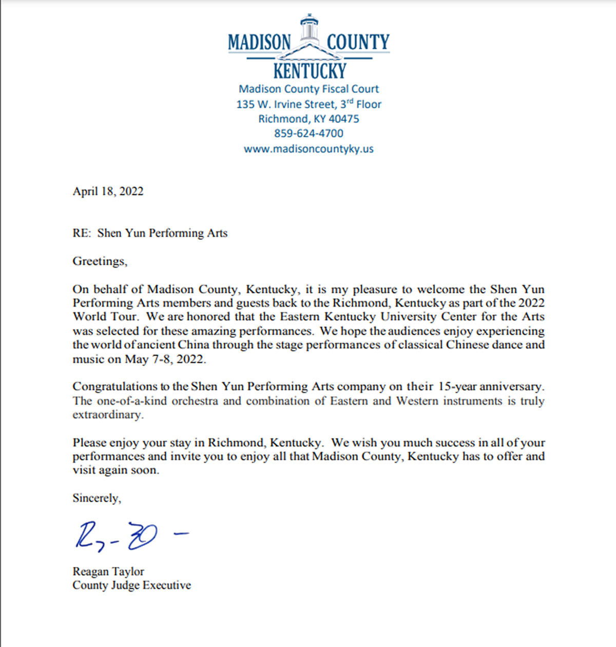 图16:肯塔基州麦迪逊县法院执行法官泰勒(Reagan Taylor)发贺信,祝愿神韵演出获得成功(大纪元)。