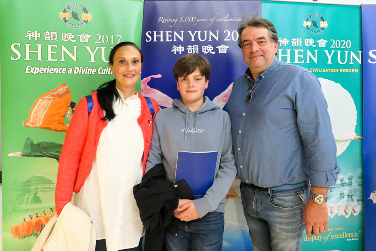 图23:二零二二年五月八日下午,巴黎企业家弗兰克‧米洛特(Frank Millot)、画家妻子娜塔莉·米洛特(Nathalie Millot)和儿子观赏了神韵纽约艺术团在巴黎国际会议中心的第五场演出。(大纪元)
