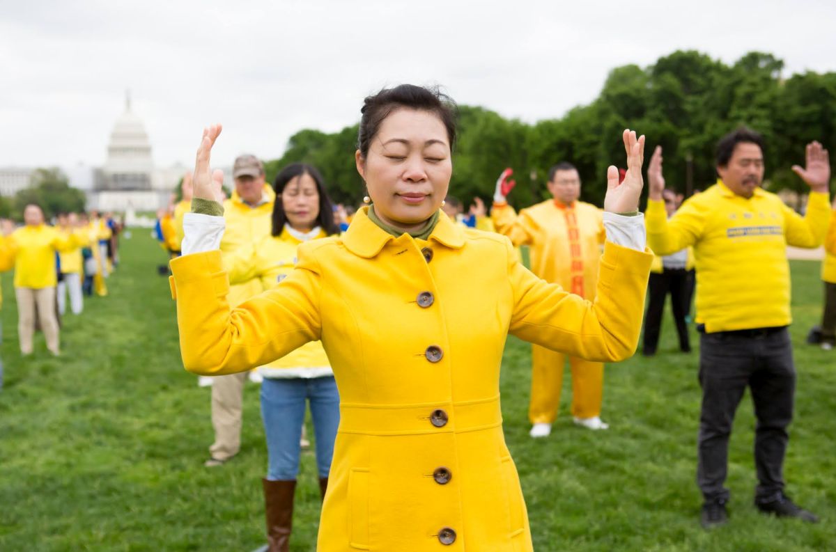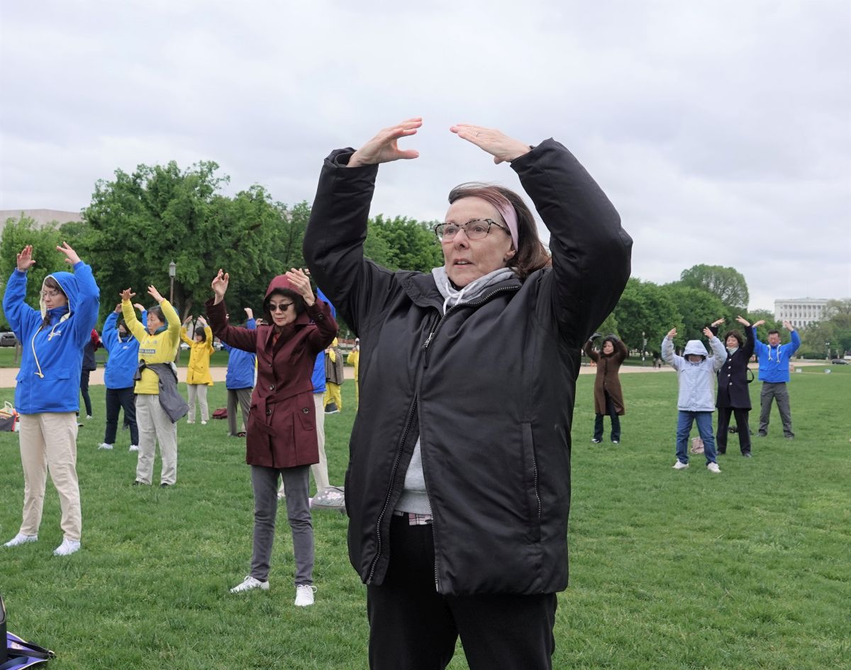 五月八日,她从邻近的弗吉尼亚州来到华盛顿,跟法轮功学员学炼功法。就在两天前,她刚刚上网学功,“今天我想自己来亲身体验。”