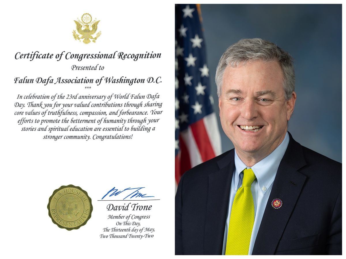 美国国会众议员戴维·特隆(David Trone)在褒奖中说:“谢谢你们通过分享真善忍核心价值观做出的宝贵贡献,通过你们的故事和精神教化,努力促进人类进步,这对于建立一个更强大的社区至关重要。祝贺!”