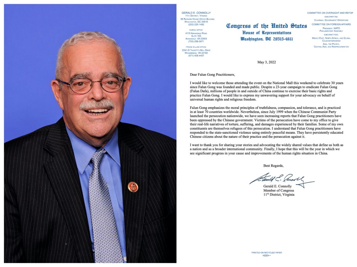 美国国会众议员杰拉尔德·康诺利(Gerald Connolly)欢迎法轮功学员在国家广场庆祝法轮大法弘传三十周年。他说:“法轮功强调真、善、忍道德原则,在全世界至少七十个(注:一百多个)国家都有人修炼。”