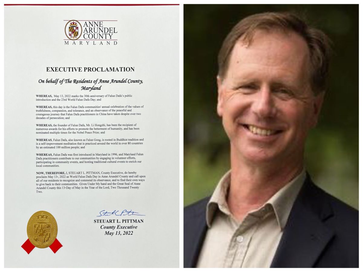 ⻢里兰州安阿伦德尔郡(Anne Arundel County)郡⻑图尔特·皮特曼(Steuart L‧ Pittman)在褒奖中说:每年这一天是法轮大法团体庆祝真、善、忍价值观,庆祝在中国的法轮大法学员和平,勇敢的历程,尽管他们二十多年来遭受着(中共)迫害。法轮大法创始人李洪志先生努力造福人类,获得无数褒奖,多次被提名诺⻉尔和平奖。
