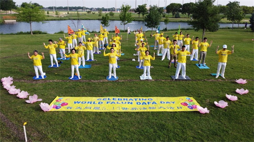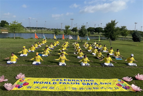 【明慧网二零二二年五月十二日】(明慧记者曾洪达拉斯报道)二零二二年五月八日上午,美国德州达拉斯-沃斯堡地区(Dallas-Fort Worth)的法轮功学员在布兰诺市(City of Plano)的 Russell Creek公园草坪上集体炼功,庆祝法轮大法弘传三十周年,恭祝法轮功创始人李洪志华诞,感恩师父的慈悲救度。