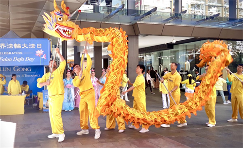 '图4~5:西澳法轮功学员在珀斯市中心步行街上以舞龙表演来庆祝法轮大法传世三十周年'