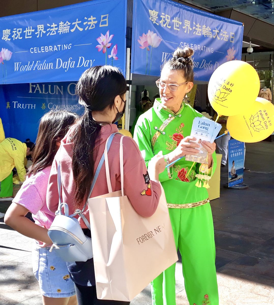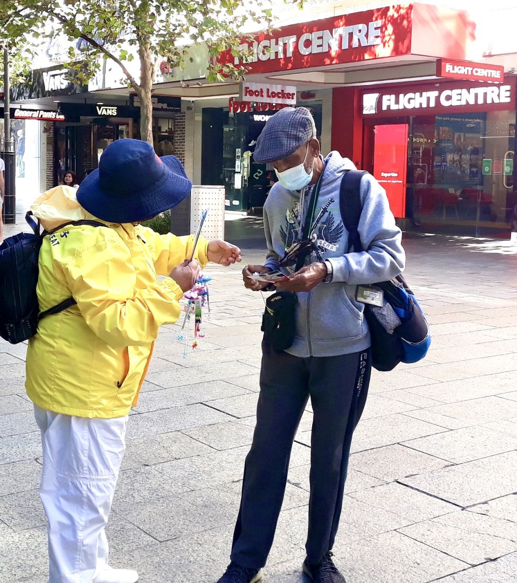 当天在珀斯市中心的步行街上,法轮功学员向民众展示法轮功五套功法、舞龙和腰鼓表演吸引众多路人驻足观看。人们接过法轮功学员送上的真相资料和小莲花,脸上露出欣喜的笑容。