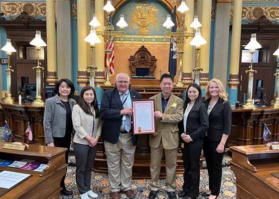 密西根州法轮大法学员代表5月12日从州参议员戴尔·佐恩手里接过了密西根州第126号决议案,该决议案宣布2022年5月13日是法轮大法日。