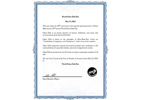在世界法轮大法日到来之际,美国科罗拉多州博尔德市颁发褒奖令,把二零二二年五月十三日定为博尔德市“世界法轮大法日”。