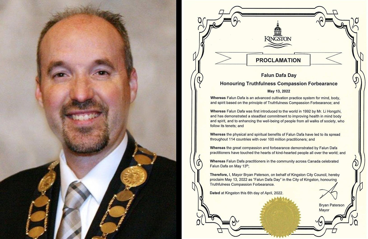 市长帕特森(Bryan Paterson)代表市议会宣布五月十三日为金斯顿市法轮大法日;当晚,市政厅亮起了彩灯以示庆祝。