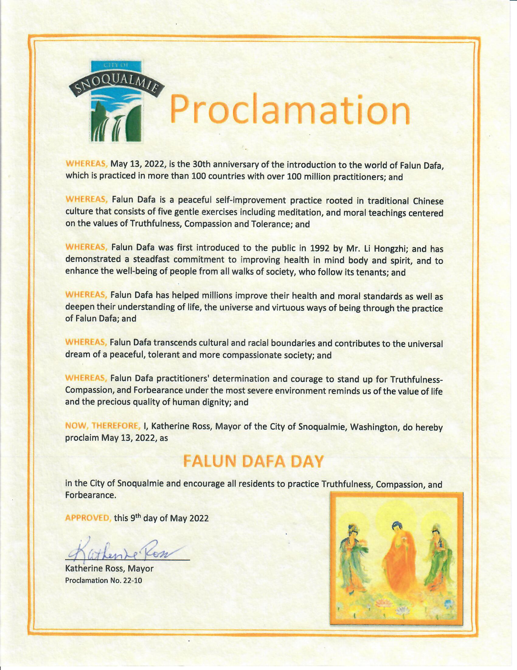 现在,因此,我,华盛顿州斯诺阔米市市长凯瑟琳·罗斯,特此宣布二零二二年五月十三日为斯诺阔米市法轮大法日, 并鼓励所有市民实践真善忍准则。