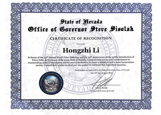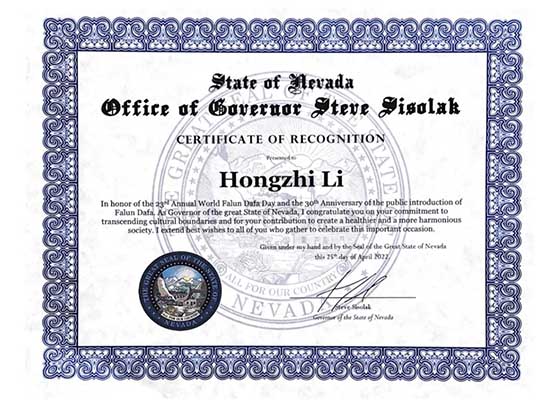 世界法轮大法日之际,美国内华达州长及六名参众议员颁发褒奖令,感谢法轮大法及创始人李洪志先生为许多人带来和平、慈悲和健康。