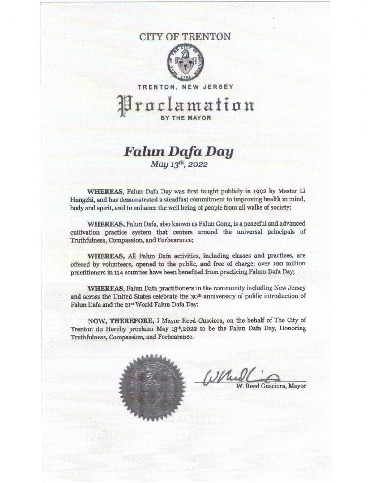 图1:美国新泽西州首府川顿市(City of Trenton)市长里德古斯多拉(W. Reed Gusciora)发来褒奖,宣布二零二二年五月十三日为“法轮大法日”,向真、善、忍致敬。