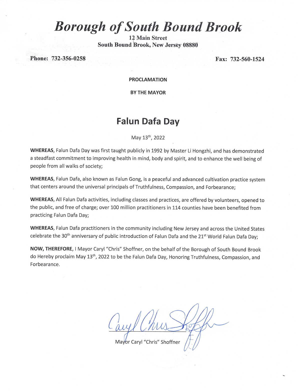 图3:新泽西州南邦布鲁克市(Borough of South Bound Brook)市长卡里尔・克里斯・肖夫纳(Caryl “Chris” Shoffner)发来褒奖,宣布二零二二年五月十三日为法轮大法日,致敬真、善、忍。