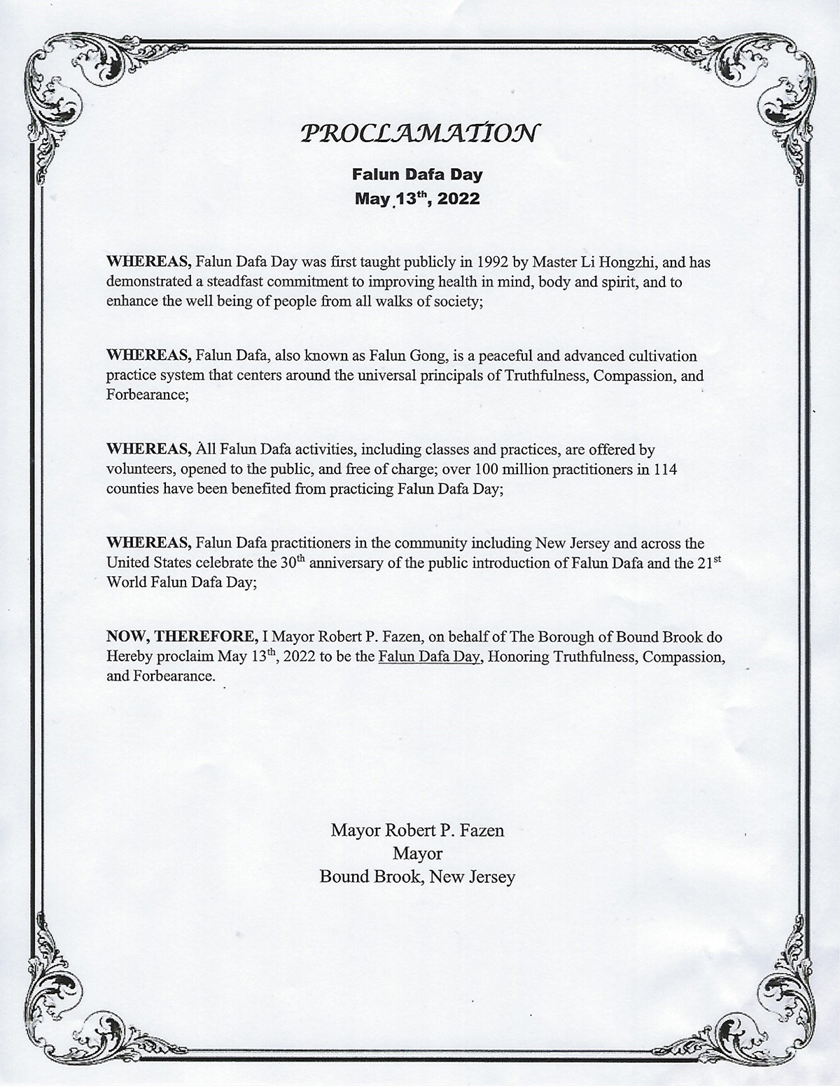 图4:新泽西州邦德布鲁克市(Borough of Bound Brook)市长罗伯特・法森(Robert P. Fazen)颁发褒奖,宣布二零二二年五月十三日为法轮大法日,致敬真、善、忍。