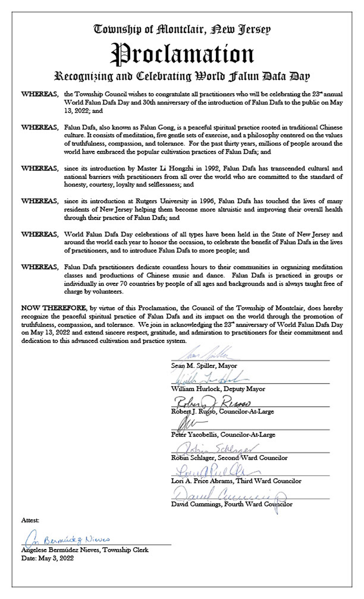 因此,根据本公告,蒙特克莱尔市议会特此宣布法轮大法的和平修炼及其通过弘扬真、善、忍对世界的影响。二零二二年五月十三日,我们共同庆祝世界法轮大法日二十三周年,为法轮大法修炼者对这一修炼体系的奉献表示由衷的敬意、感谢和钦佩。