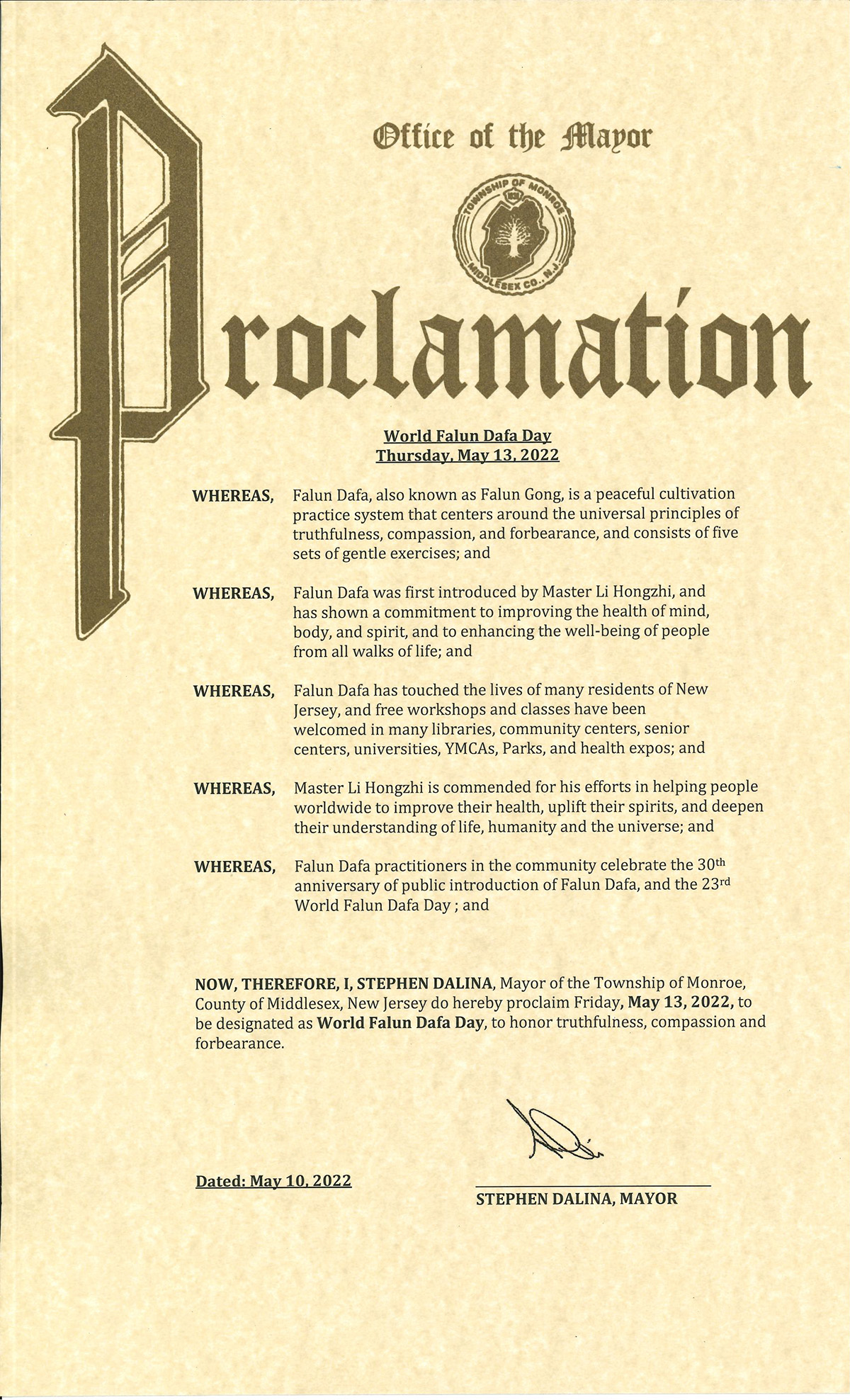 因此,现在,我,新泽西州米德尔塞克斯郡门罗市市长斯蒂芬・达利娜特此宣布,二零二二年五月十三日星期五被定为世界法轮大法日,以纪念真、善、忍。