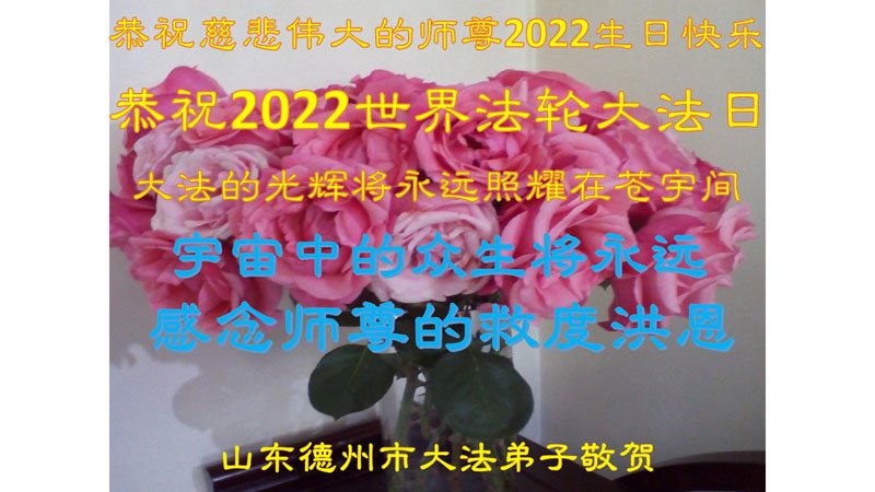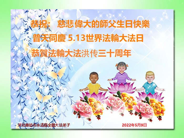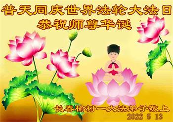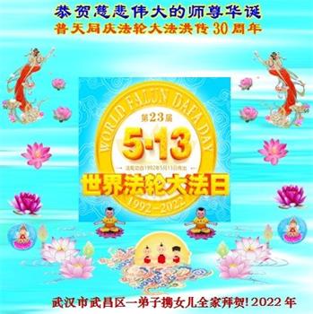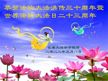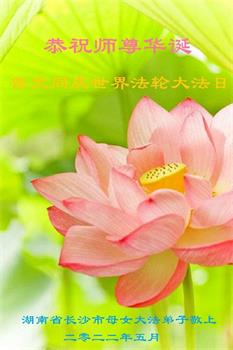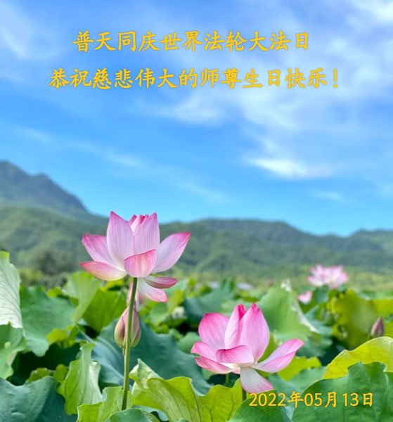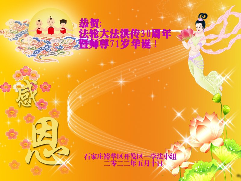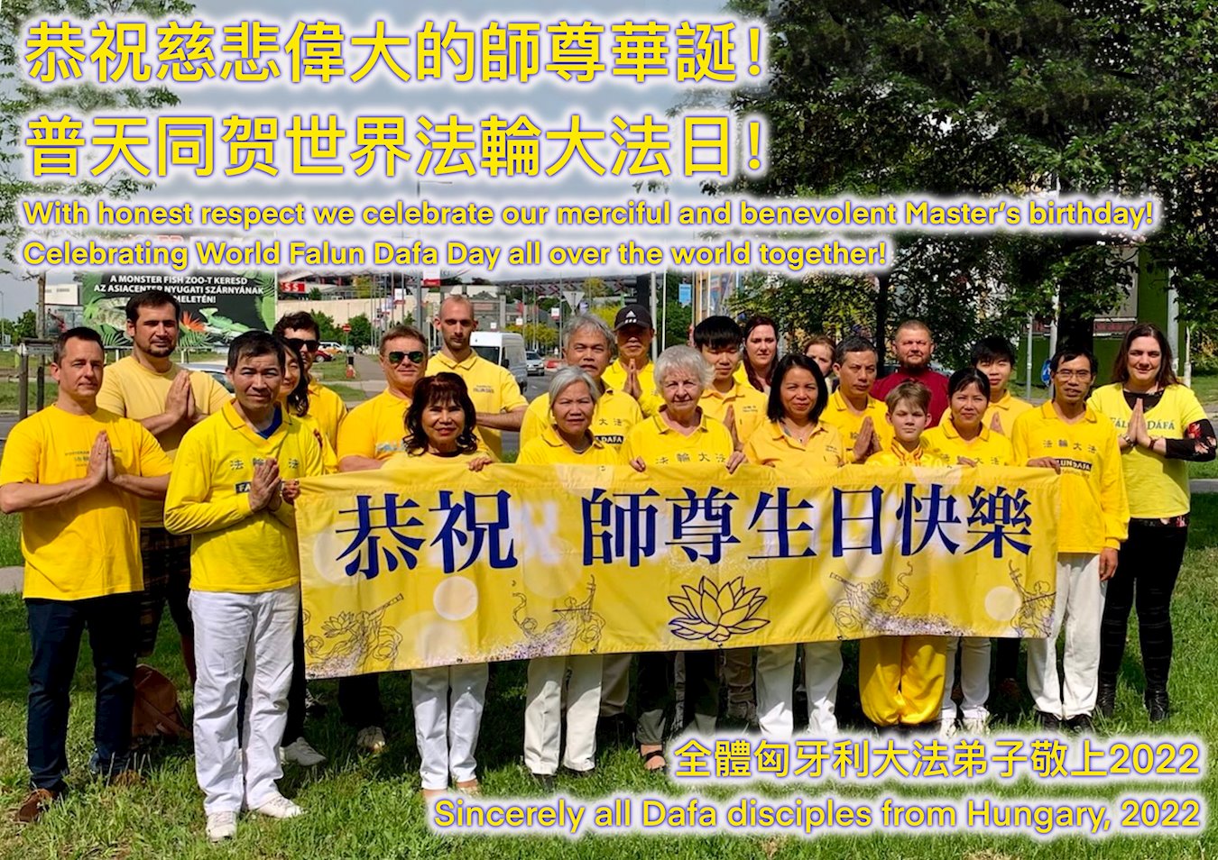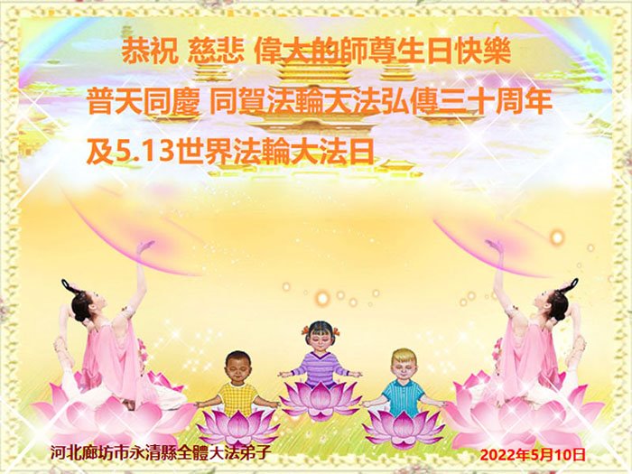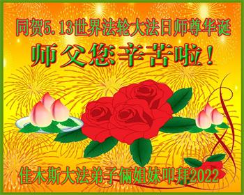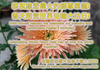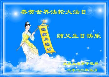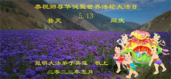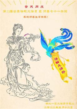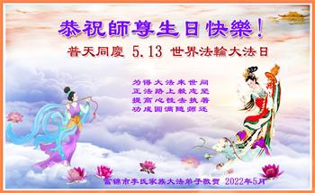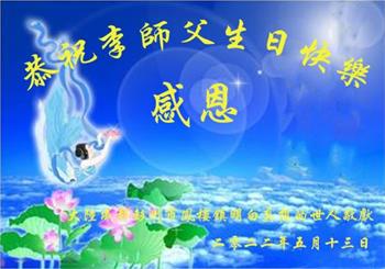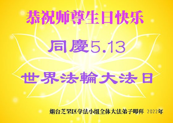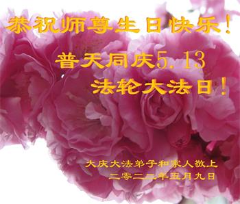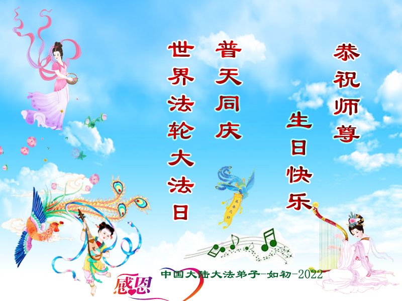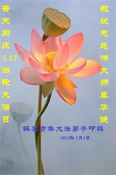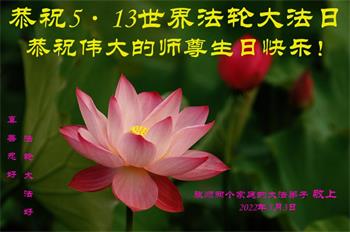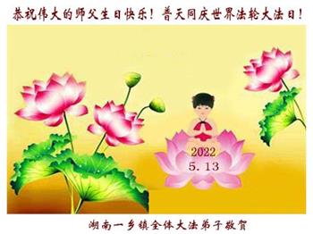 伟大的正法走到今天,迎来了大法洪传三十周年。佛恩浩荡,乾坤再造,穹宇感念!在这伟大的历程中,师尊救度并造就了我们,也救度了无量穹体、无尽众生于坏灭,赐予了我们与众生未来的一切。弟子们与众生对师父、对大法无比感恩之心难以言表。值此二零二二年世界法轮大法圣日来临之际,法国大法弟子向慈悲伟大的师尊表达问候与感恩!恭贺大法洪传三十周年!恭祝师父生日快乐!