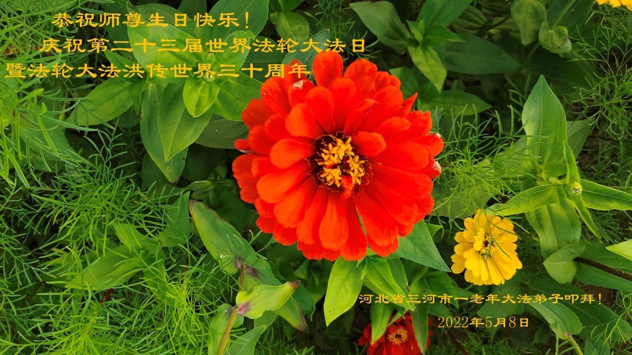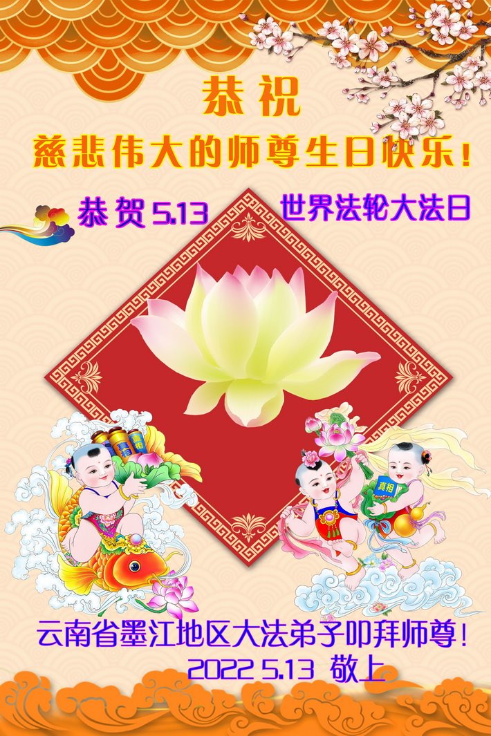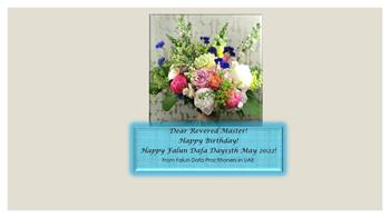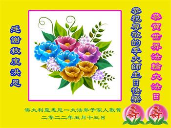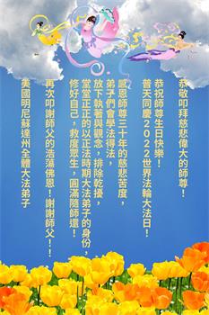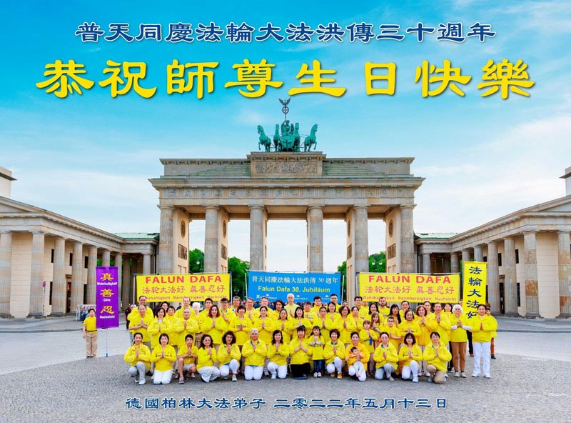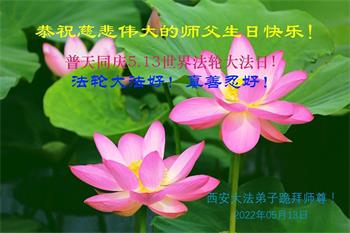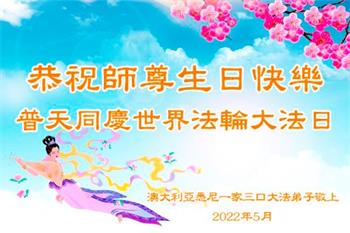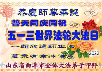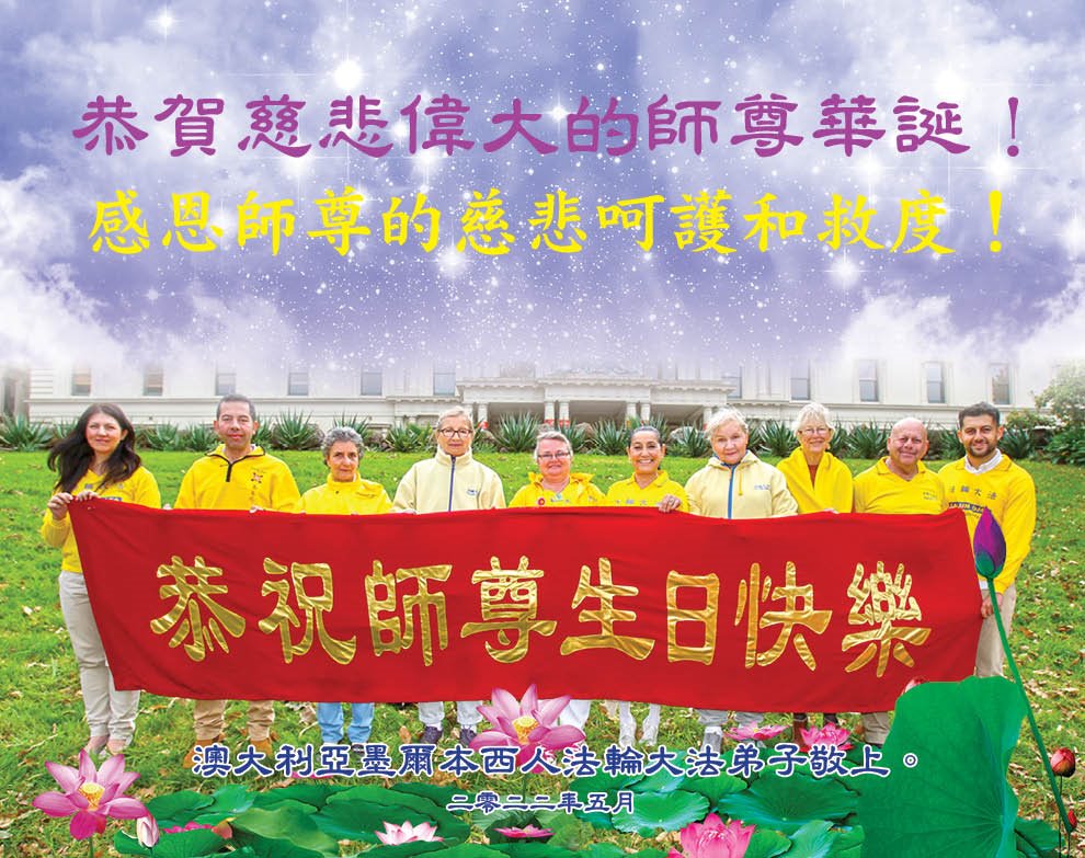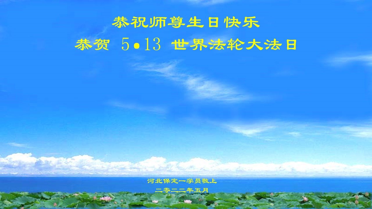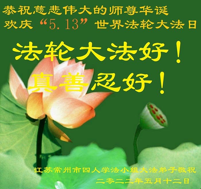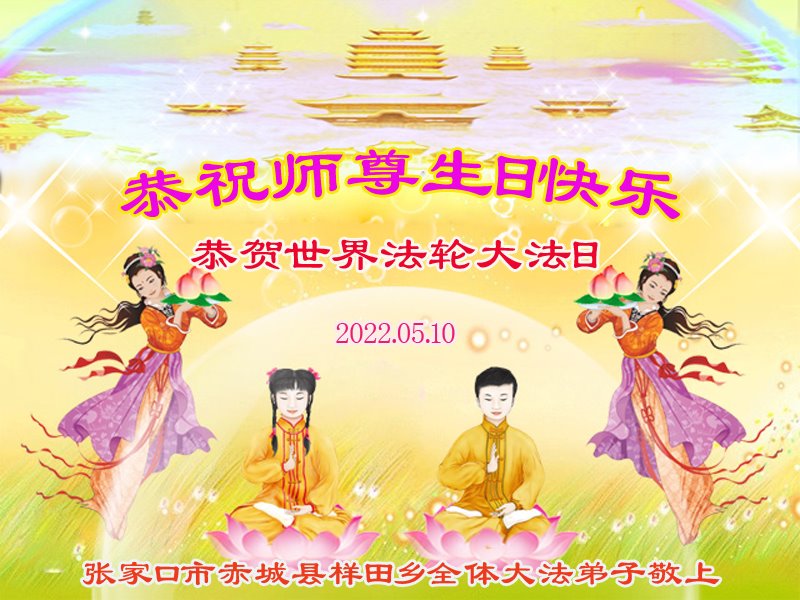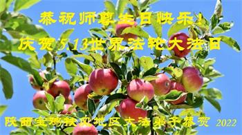 伟大的正法走到今天,迎来了大法洪传三十周年。佛恩浩荡,乾坤再造,穹宇感念!在这伟大的历程中,师尊救度并造就了我们,也救度了无量穹体、无尽众生于坏灭,赐予了我们与众生未来的一切。弟子们与众生对师父、对大法无比感恩之心难以言表。值此二零二二年世界法轮大法圣日来临之际,法国大法弟子向慈悲伟大的师尊表达问候与感恩!恭贺大法洪传三十周年!恭祝师父生日快乐!