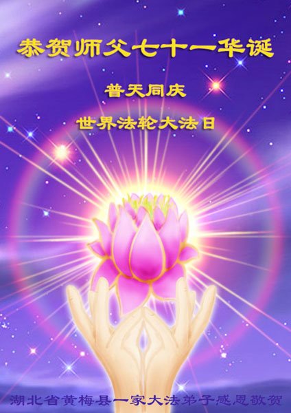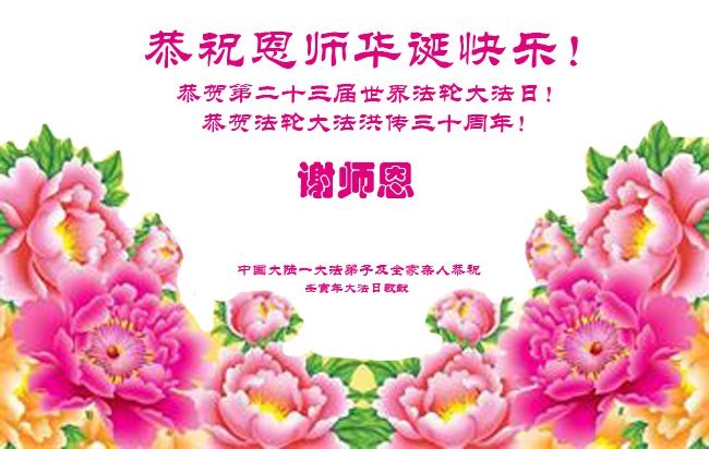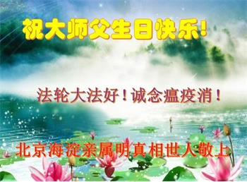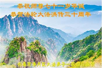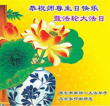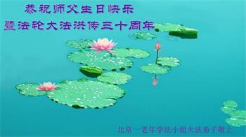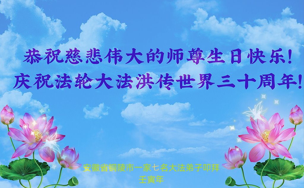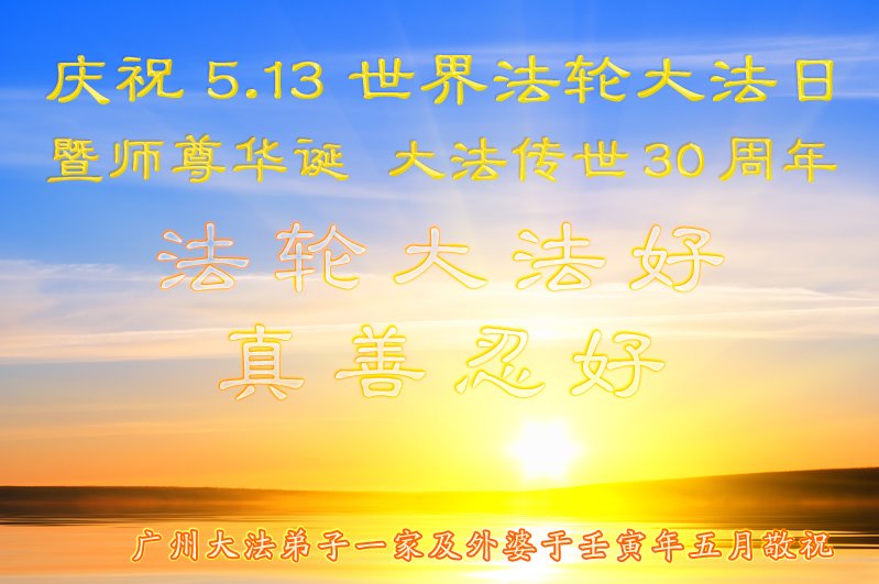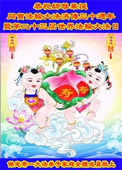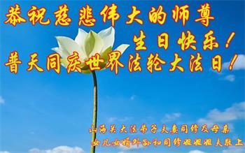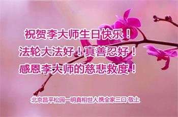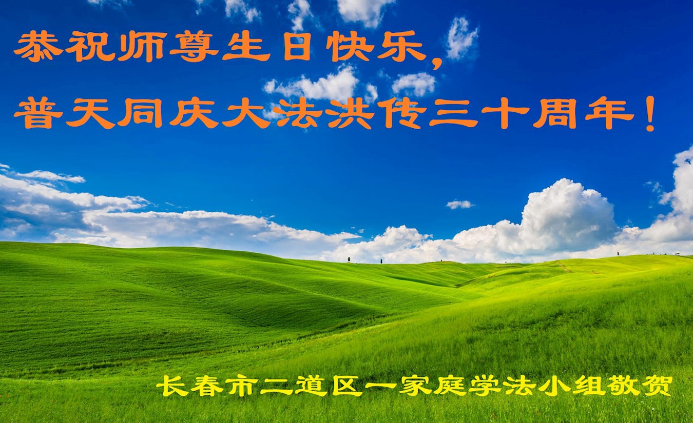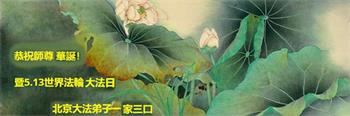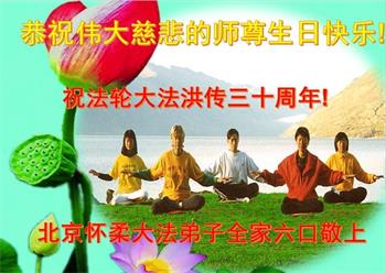 我是一个大法弟子的家人,妻子修大法,我也是个受益人,多次得到大法师父的救度,恭祝大法洪传三十周年!恭祝师父生日快乐!谢谢师父!谢谢大法!