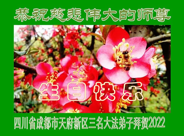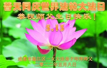 成都市一位市民在危难中得到了大法弟子教给的九字真言——“我就天天念,有空就念,念得我心情舒畅极了。现在,我脸色红润,神清气爽,而且生意也特别兴旺。我衷心的感谢李大师的救命之恩!我带着我的家人叩头,敬祝李大师生日快乐!”