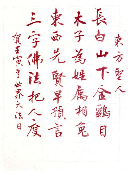 这时您的弟子来买商品,见我脸色土黄、带着青色,就问我:“你脸色咋这么难看?”我说食物中毒,打针输液半个月了,花了不少钱,还没好。您的弟子就给我讲了九字真言等大法真相,我当即就退出了中共邪党附属组织少先队,诚心的念起了“法轮大法好、真善忍好”。