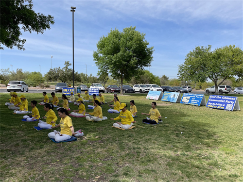 图2:二零二二年五月七日,美国拉斯维加斯部分法轮功学员在市区春山路的沙漠微风公园(Desert Breeze)举行活动,庆祝世界法轮大法日,和法轮大法洪传世界三十周年,暨法轮功创始人李洪志大师七十一岁华诞。