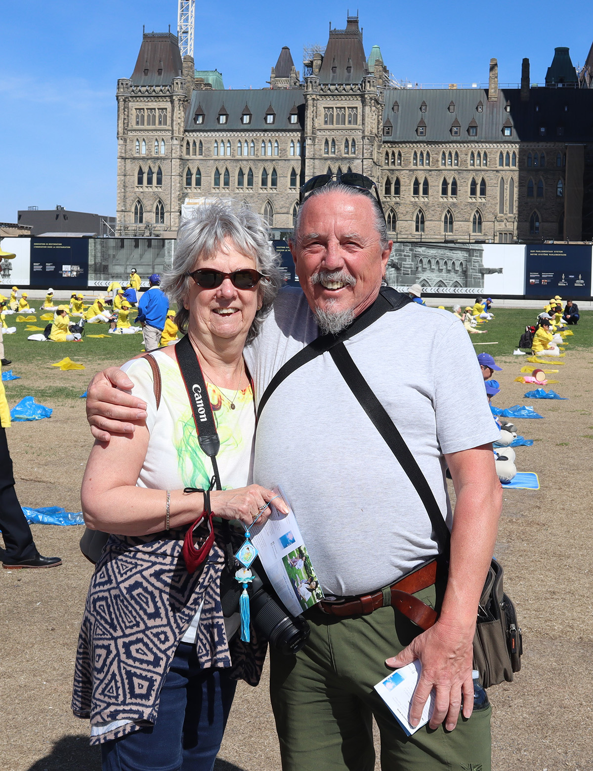 吉尔(Jill)和托尼(Tony)是到加拿大旅游的一对英国夫妻,吉尔在听完学员向她介绍大法后,她说:“我每天都会练习瑜伽,这是我第一次听说法轮功。我和丈夫在看到法轮功学员大炼功的场面后,感到好壮观。”