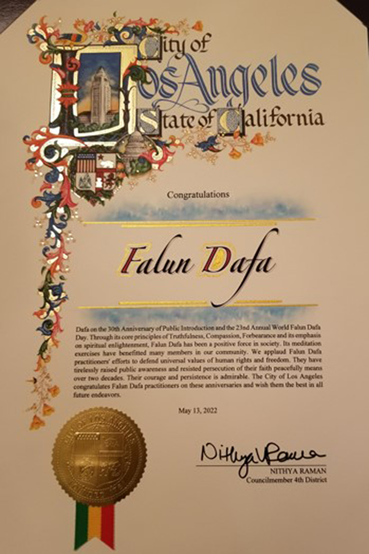 法轮大法以真、善、忍为核心原则,强调精神启悟,成为社会的正面力量。其打坐功法让我们社区许多人受益。我们表彰法轮大法学员维护人权、自由的普世价值的努力。在过去二十多年里,他们不辞辛劳,告知大众真相,抵制(中共)对他们信仰的迫害。他们的勇气与毅力令人钦佩。在他们的周年纪念日里,洛杉矶市祝贺法轮大法学员,并为他们未来所有的努力献上最美好的祝愿。
