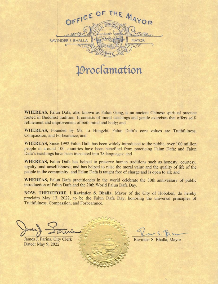 【明慧网二零二二年五月十六日】二零二二年五月十三日,是第二十三届世界法轮大法日,也是大法洪传世界三十周年,更是法轮功创始人李洪志先生的华诞。美国新泽西州继十八市一郡颁布褒奖,宣布法轮大法日,向真、善、忍致敬,又有五个市颁布褒奖,并祝愿现在和未来共享和平与繁荣。